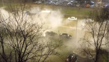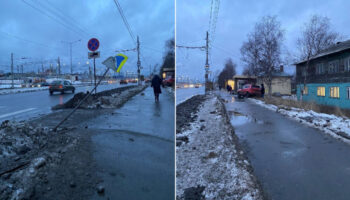Кроссовер погнул дорожный знак и вылетел на тротуар в Петрозаводске