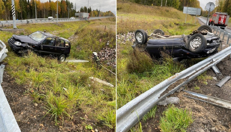 На трассе А-121 в лобовую столкнулись два автомобиля. Один из них перелетел через барьерное ограждение и упал на крышу. Помощь спасателей, полиции и медиков потребовалась на месте аварии утром 7 октября.