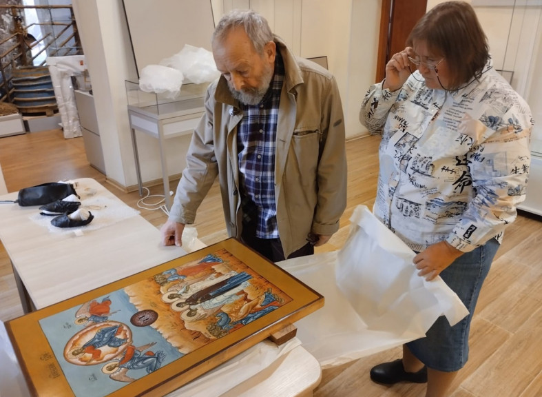Пока что все желающие могут увидеть написанные иконы в музее Кондопоги. Экспозиция будет открыта до 8 декабря, а потом образа отправят в приход – на первую зимовку. Ведь иконы должны адаптироваться к холоду, церковь была летней и не отапливалась. // фото: правительство Карелии