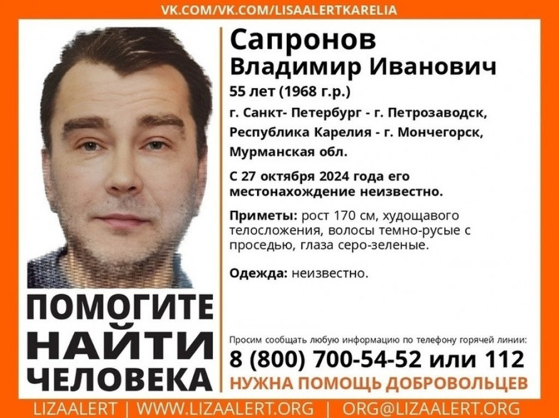 Уже почти две недели в Карелии ищут 55-летнего Владимира Ивановича Сапронова. По данным волонтеров «ЛизаАлерт», он может быть в Санкт-Петербурге, Карелии или Мурманской области.