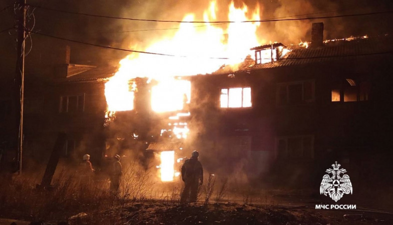 По предварительным данным МЧС Карелии, огонь повредил около 400 квадратных метров площади расселенного дома. // фото пресс-службы МЧС по РК