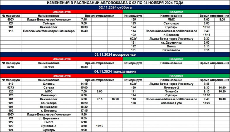 Так, 2-4 ноября в связи со смещением рабочих и выходных дней отменяется ряд рейсов, в частности, в Олонец, Сегежу, Кончезеро, Святозеро, Лососинное и т.д. В то же время ряд других автобусов вводится, например, в гарнизон Бесовец, Вилгу, Лехнаволок, Лучевое-2, Пиньгубу и т.д.