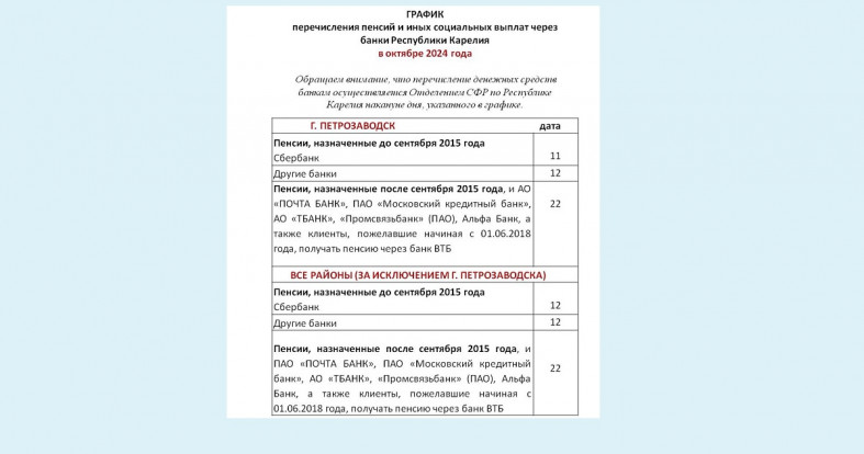 Карельское отделение Соцфонда представило график выплаты пенсий и пособий в Карелии в октябре. Перечислять деньги на выплаты семьям с детьми за сентябрь начнут уже 3 октября. Также будут перечислены пособие на детей и беременным; пособие по уходу за ребенком неработающим родителям; выплата в связи с рождением (усыновлением) первого ребенка и ежемесячная выплата на ребенка военнослужащих.